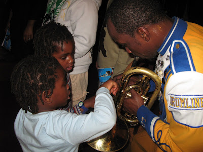 Finally it was time to go into see Drumline live. Turns out, Drumline live is far far far more than just some marching band drumming. It’s like seeing traditional African drumming and singing, Motown, HBCU marching bands, New Orleans Jazz, swing and gospel through the lens of a high octane, dynamic HBCU marching band with dancers and all. Heather had managed to get us 4th row seats – we were about 6 feet from the trumpets as they blasted fortisisissimo and marched. One of the best things about it was that although the audience at Lehigh was most definitely white, the production was not geared toward a white audience. I got the distinct sense that they played it straight up – and would do that for a white or a black audience (although the level of audience interaction with this white audience was pretty minimal).